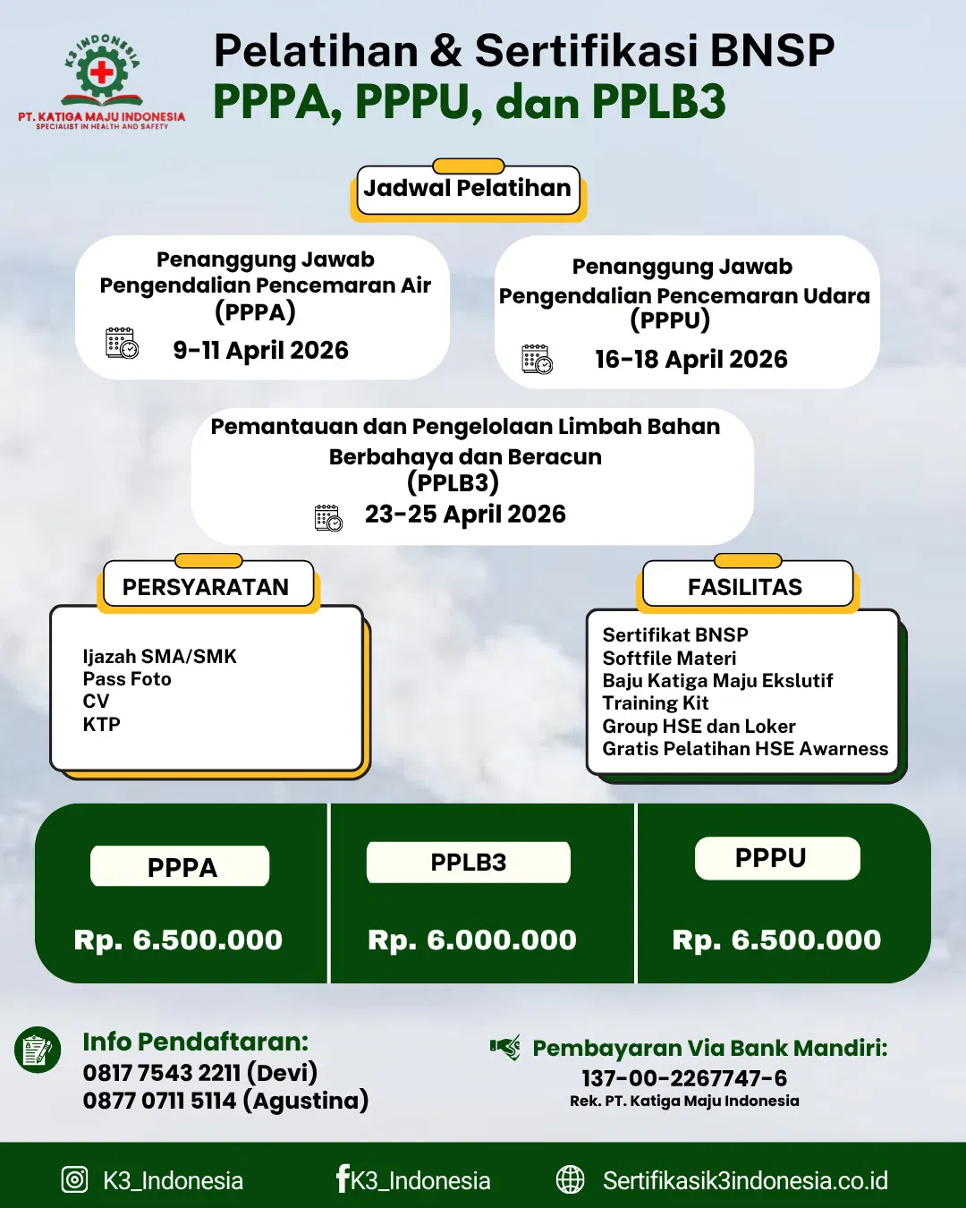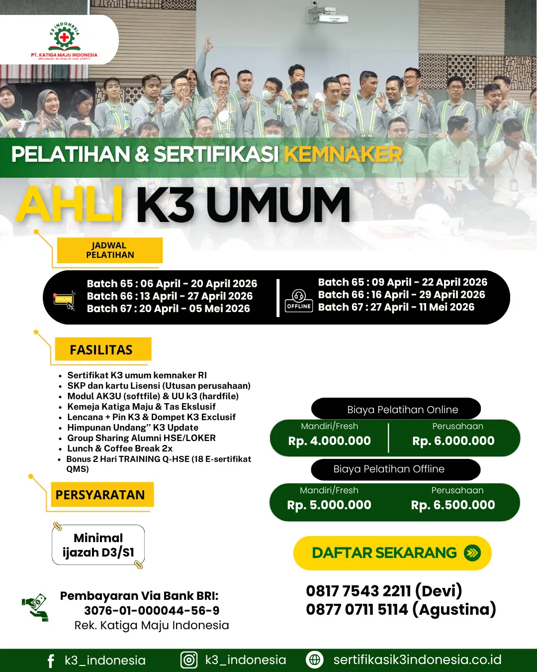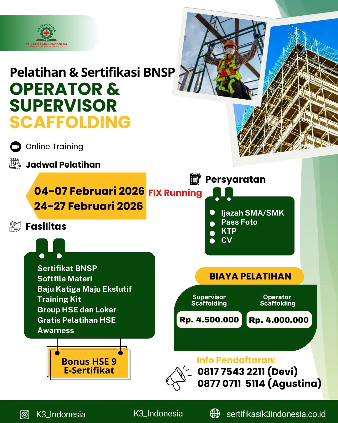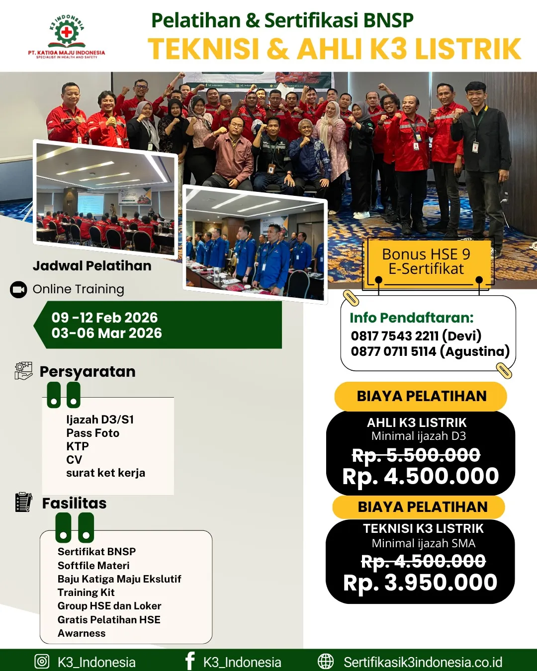 Sertifikasi K3 Indonesia adalah lembaga penyelenggara pelatihan dan sertifikasi keselamatan dan kesehatan kerja (K3) yang membantu perusahaan dan profesional memenuhi standar keselamatan kerja nasional. Kami menyediakan program pelatihan Ahli K3 Umum resmi Kemnaker dengan instruktur berpengalaman, materi terbaru, dan sertifikasi yang diakui secara nasional. resmi Kemnaker RI dan BNSP yang melayani peserta dari seluruh Indonesia. Layanan program sertifikasi kami : Ahli K3 Umum, K3 Listrik, K3 Migas, Operator, P3K dan lain-lain dengan program lengkap dan instruktur Profesional.