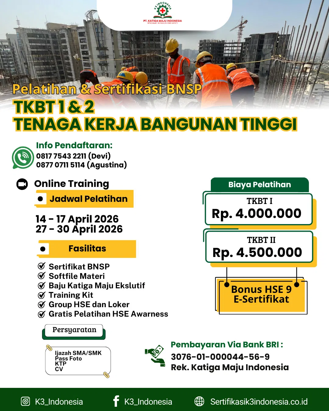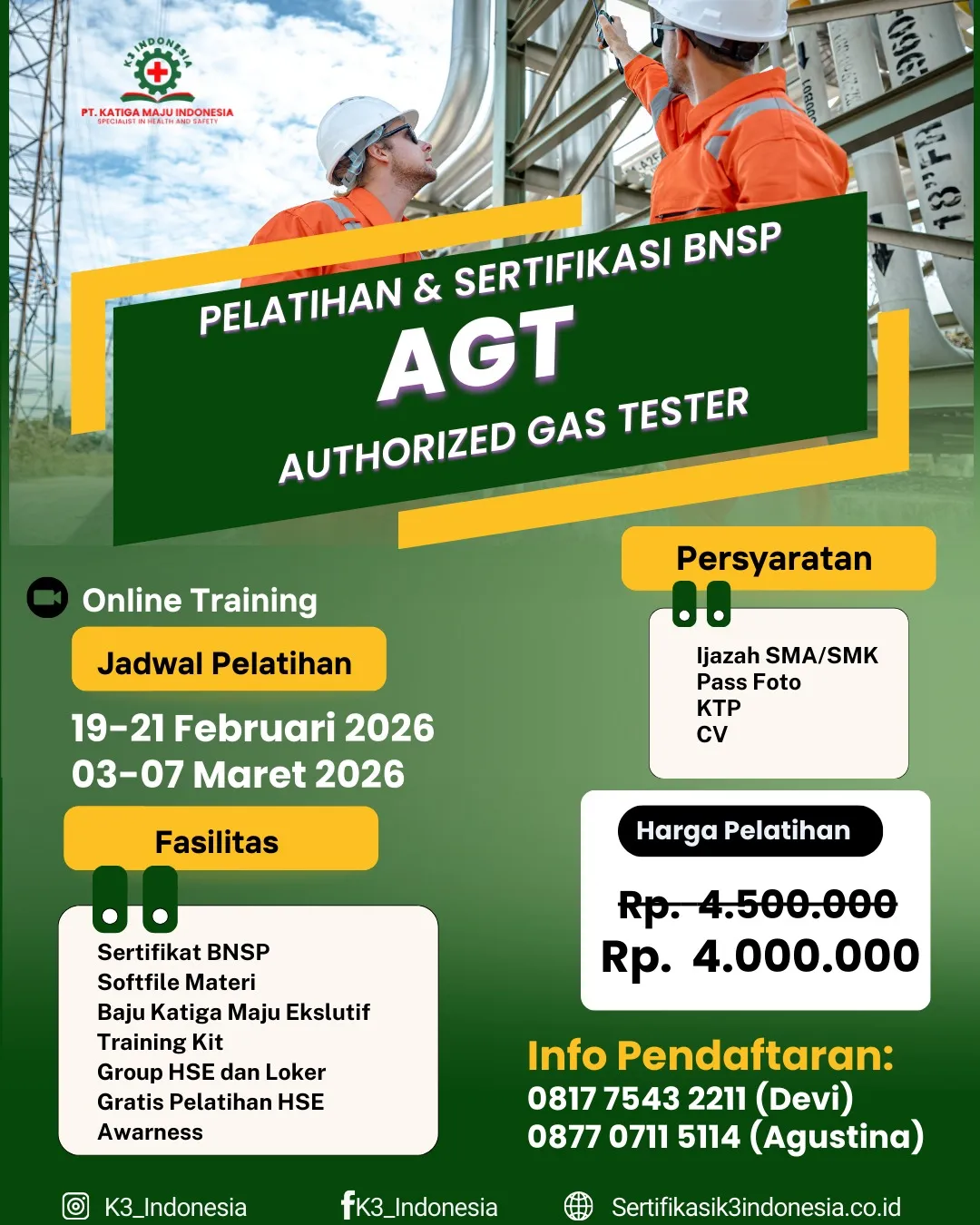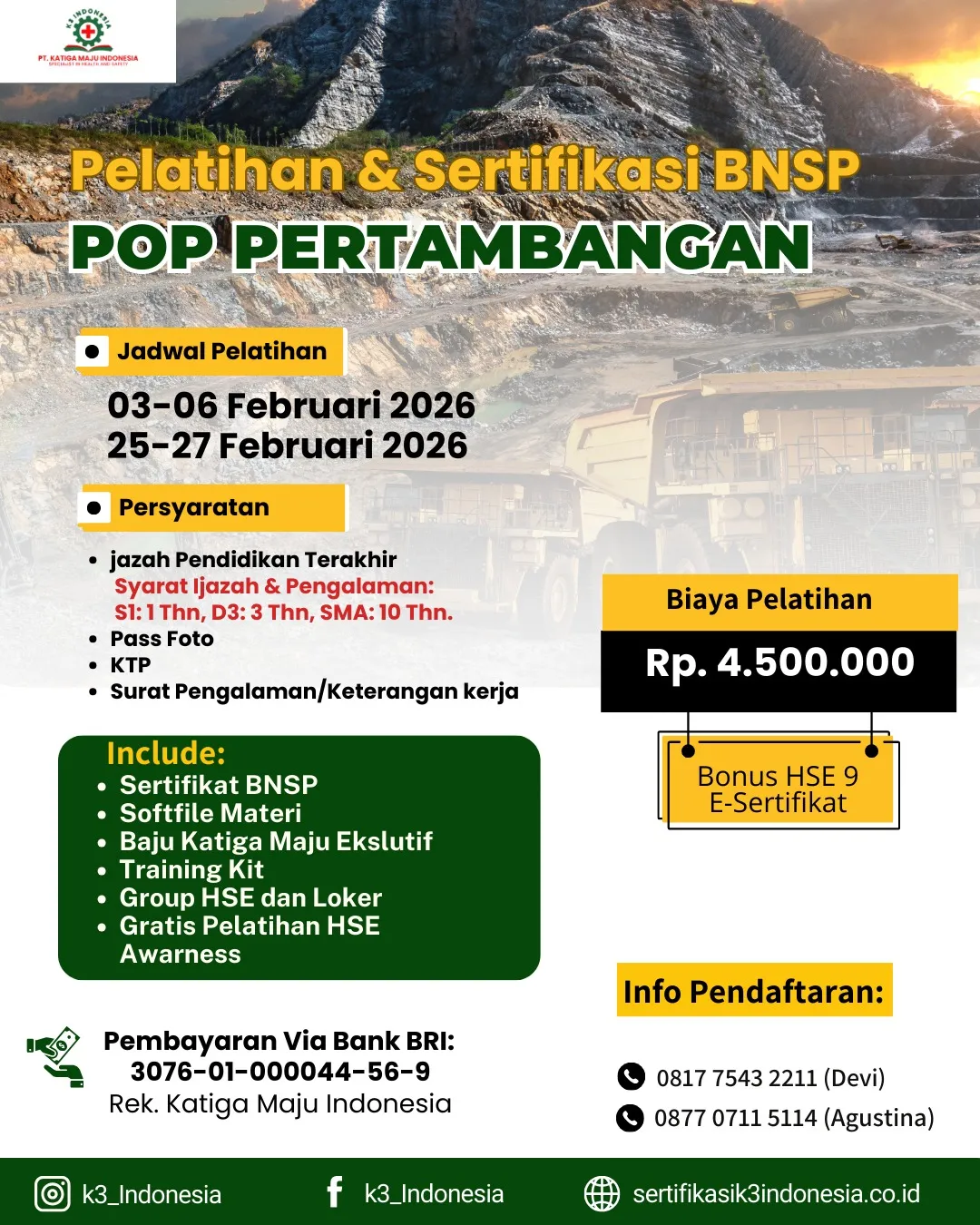 PT. KATIGA MAJU INDONESIA merupakan Perusahaan Training dan Konsultan yang mendedikasikan diri untuk mendukung profesional dan perusahaan disemua sektor bisnis industri dan jasa. Kami menyediakan jasa pelatihan, sertifikasi, riksa uji dan konsultasi dibidang Kesehatan dan Keselamatan Kerja (K3), Pelatihan Lingkungan, Manajemen Sumberdaya Manusia, Productivity dan Quality sesuai regulasi resmi dari Kementerian Ketenagakerjaan Republik Indonesia. Kami berkomitmen untuk memberikan pelayanan Training dan Konsultan yang terbaik dan berkualitas bagi semua pelanggan dengan didukung oleh tenaga profesional yang kompeten dibidangnya, yang akan meningkatkan kemampuan mereka dalam bidang keahlian masing- masing sehingga bisa meningkatkan produktifitas dan daya saing perusahaan.