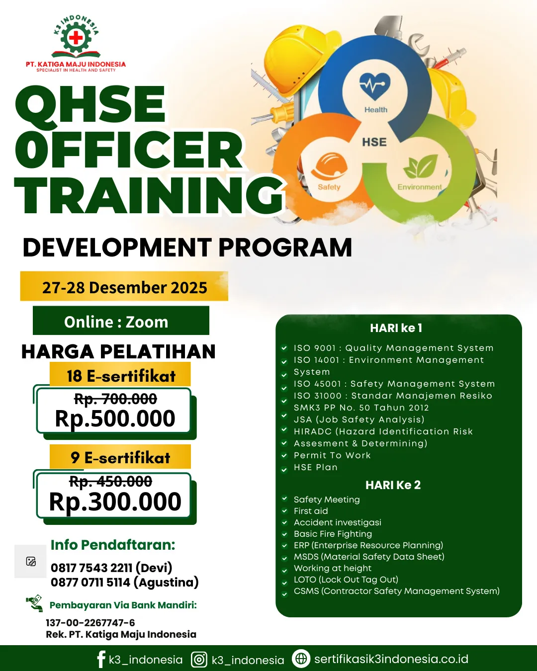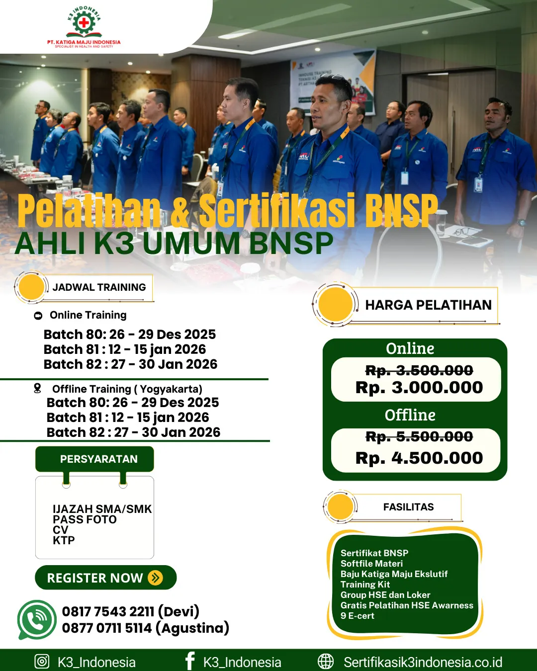 • Durasi Total Pelatihan Pengawas K3 Rumah Sakit BNSP : 3 Hari Pelatihan