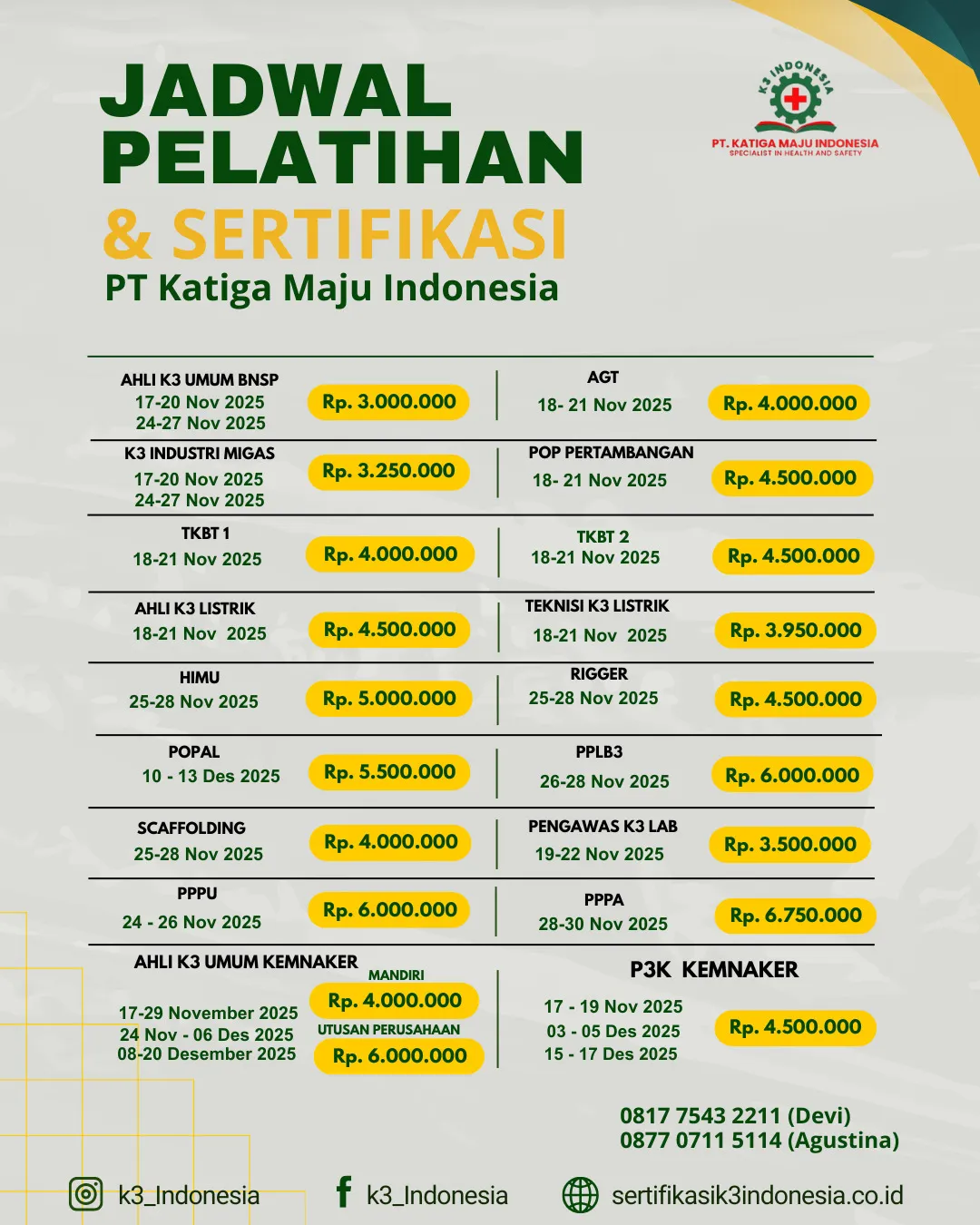 PT. Katiga Maju Indonesia merupakan Perusahaan Training dan Konsultan yang mendedikasikan diri untuk mendukung profesional dan perusahaan disemua sektor bisnis industri  dan jasa.  Kami menyediakan jasa  pelatihan, sertifikasi, riksa uji dan konsultasi dibidang Kesehatan dan Keselamatan Kerja (K3), Pelatihan Lingkungan, Manajemen Sumberdaya Manusia, Productivity dan Quality. Kami  berkomitmen  untuk  memberikan  pelayanan Training dan Konsultan yang terbaik dan berkualitas bagi semua pelanggan  dengan  didukung  oleh  tenaga  profesional yang  kompeten  dibidangnya,  yang  akan meningkatkan kemampuan mereka dalam bidang keahlian masing- masing sehingga bisa meningkatkan produktifitas dan daya saing perusahaan.